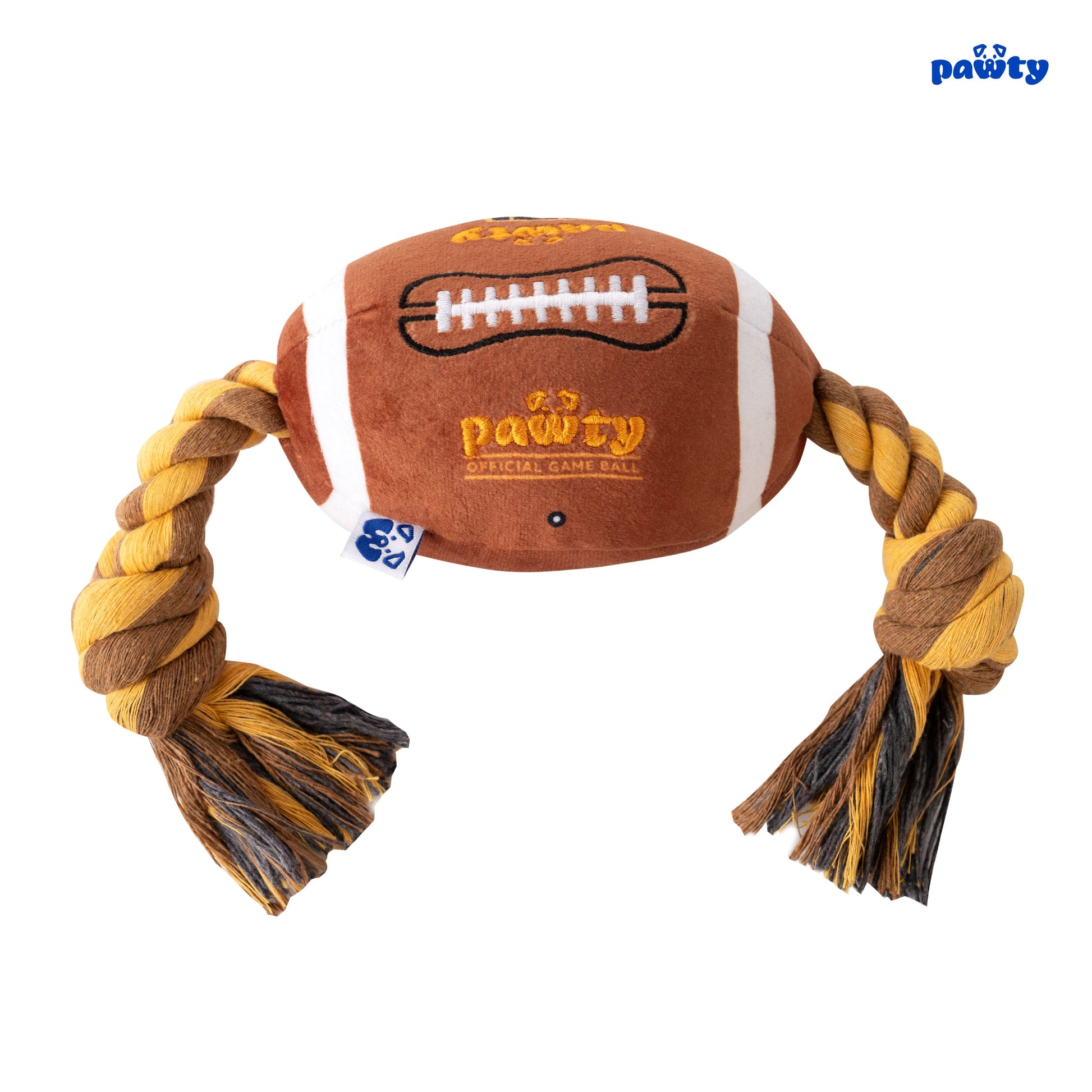 Get ready for game day with the PAWTY Football, a plush football interactive dog toy built for serious play! Designed with a durable tug rope for fetch and tug sessions, this toy includes a squeaker to elevate the fun and engagement. Its sports-themed design makes it perfect for small to medium-sized pups, doubling as a training tool and unique birthday gift that any dog will love!