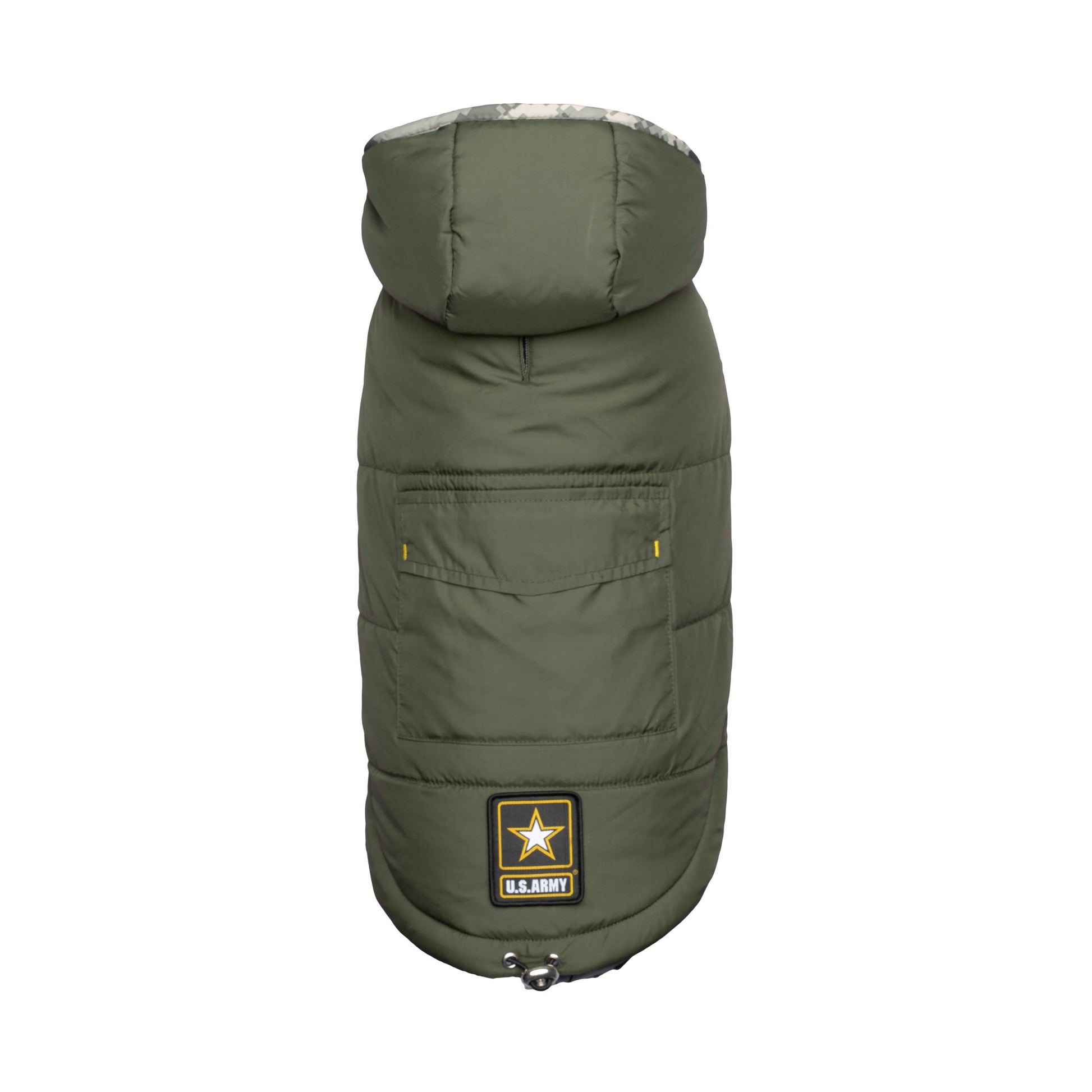 This official licensed US Army® Dog Parka is the perfect mix between fashion and function. With its warm polar fleece lining, camouflage contrast binding on a tackable hood, yellow accents, large back pocket to carry waste bags and a convenient leash hole, this great value dog coat will turn heads! Fit your dog easily in his cozy us army parka with front velcro closure and bungee cord with stopper to adjust. Dark camo (solid army green) with yellow detail and official US Army logo patch.