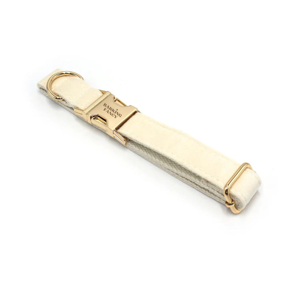 - Velvet collar with engraved quick-release brass buckle
